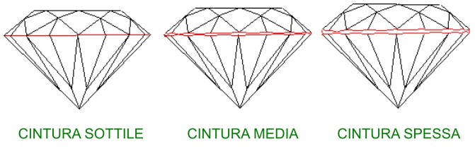 La cintura in un diamante e' la parte centrale e corrisponde con il punto in cui il diametro e' maggiore, la misura varia da 'molto sottile' a 'molto spessa':