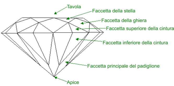 Il taglio brillante ha faccette triangolari che circondano la pietra e culminano su una sommita' piatta chiamata 'tavola'. Osservate la figura per notare come le faccette triangolari si incastrano l'una sull'altra. Il moderno taglio rotondo a brillante ha 58 di queste faccette, 33 nella parte superiore chiamata 'corona' e 25 nella parte inferiore chiamata 'padiglione', la parte sottile che divide la corona dal padiglione si chiama 'cintura'.