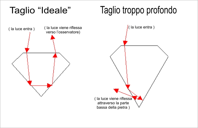 Nel diamante ideale, tutta la luce che entra dalla sommita' superiore rimbalzera' all'interno della pietra e verra' riflessa nuovamente attraverso la cima, dando alla pietra il Massimo dello 'scintillio' e del 'fuoco'. Se la pietra e' troppo bassa o troppo profonda, una parte della luce fuggira' dalla parte inferiore del diamante, dando l'apparenza di ombre quando la pietra viene osservata dall'alto.