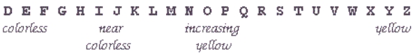 Perche' un diamante possa essere considerato privo di colore (colorless) il G.I.A. richiede che stia tra i valori D, E o F e sono pietre che di solito vengono impiegate per investimento finanziario. Comunque la scala e' continua e la differenza tra un F ed un G e' davvero irrilevante. Solitamente i migliori diamanti impiegati in gioielleria vanno dal G al H.